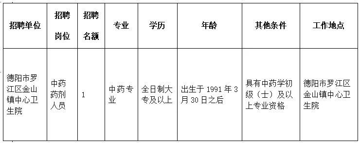因工作需要,罗江区健康共同体成员单位——金山镇中心卫生院,现面向社会紧急招聘编外中药药剂人员1名。招聘具体专业及条件公告如下: